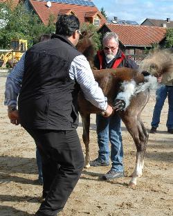 In seiner gewohnt gekonnten Art, erklärte der Vorsitzende des ZSAA Herr Al Samaraie den interessierten Zuschauern die Kriterien der Eintragung der Fohlen. Die genaue Beschreibung von Abzeichen, Wirbeln und anderen Merkmalen, die im Equidenpass vermerkt werden, machen das "Chippen" der Pferde eigenlich überflüssig.